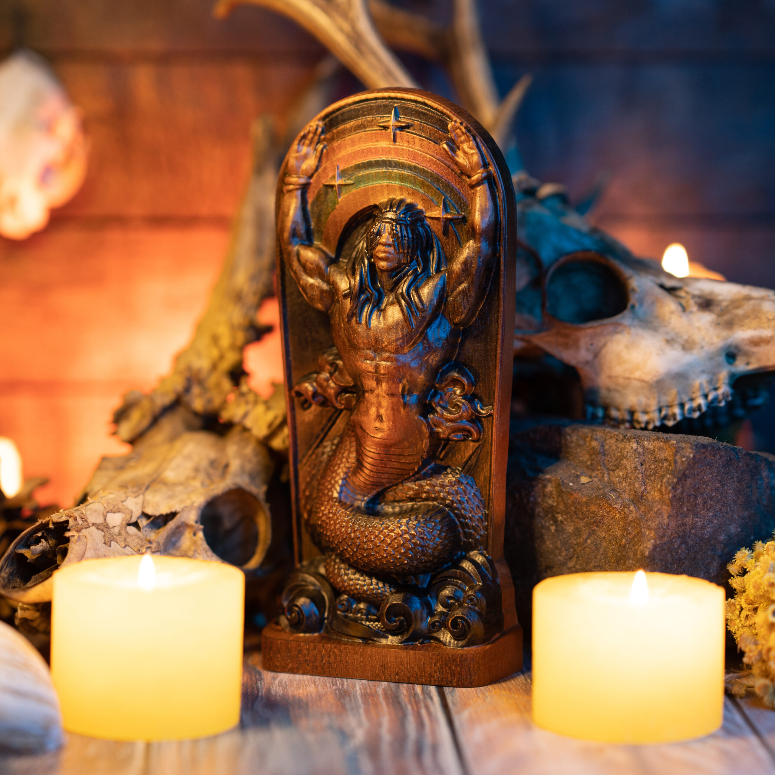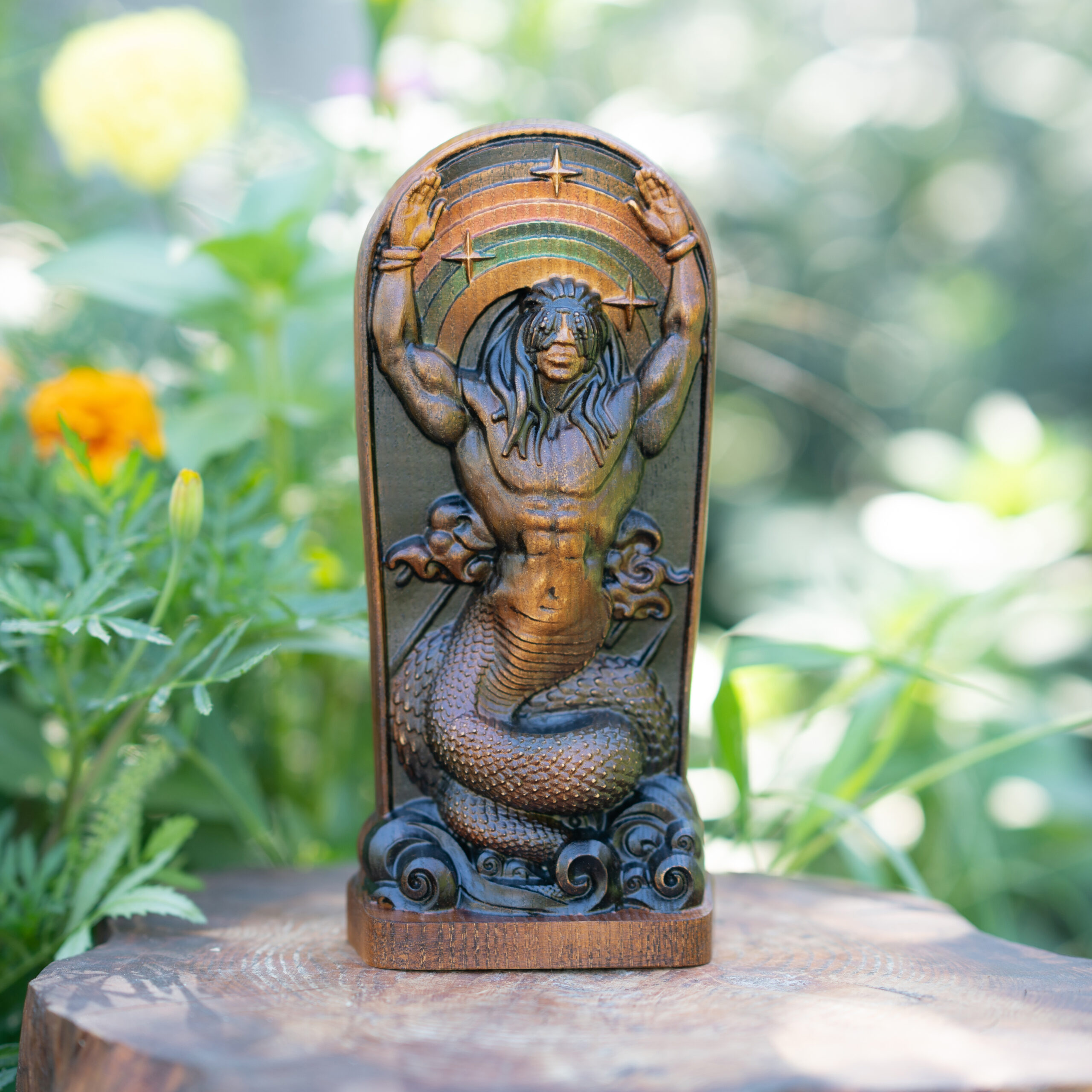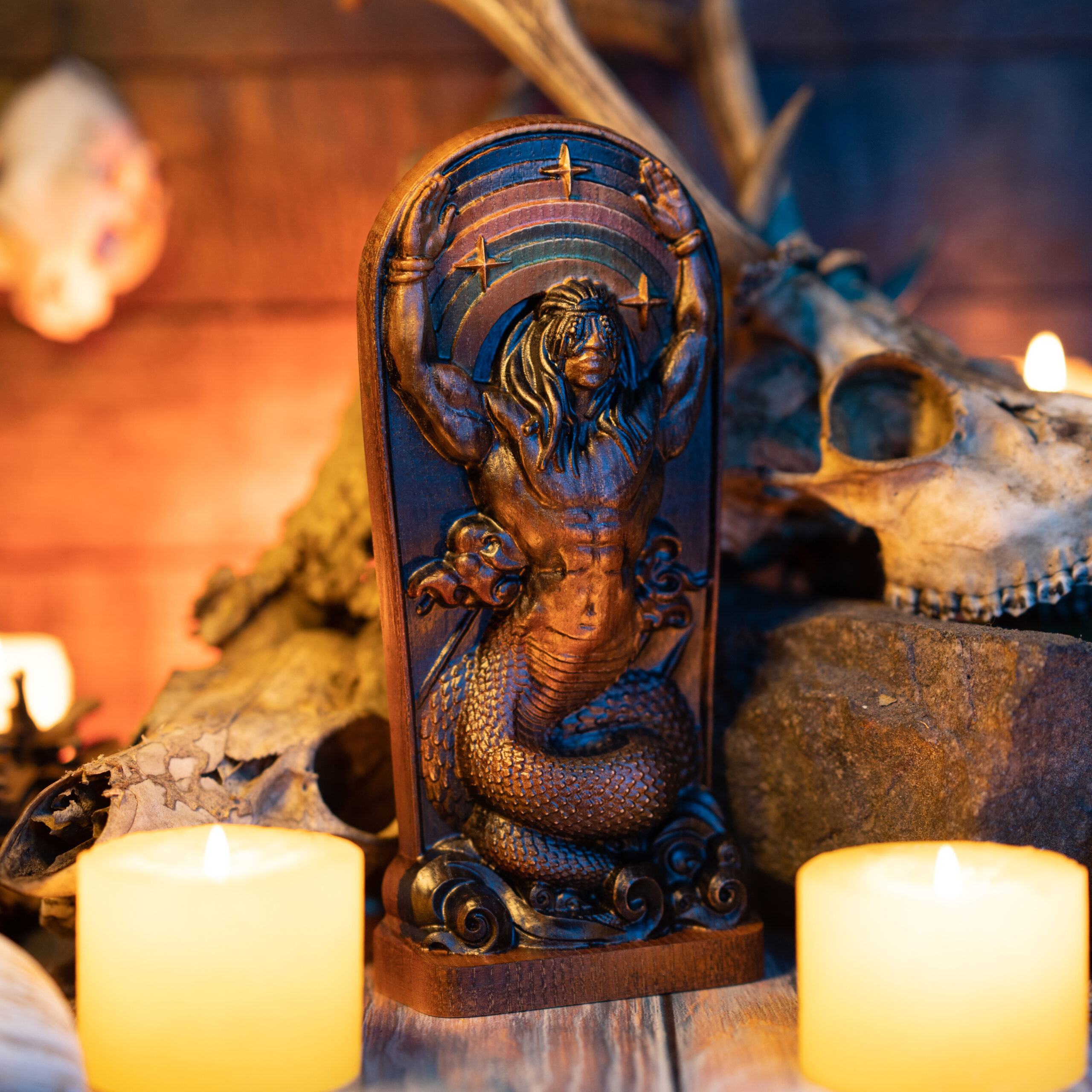 By shedding the serpent skin, Damballa created all the waters on the earth. Sun shone in the water and created Ayda-Vedo (Rainbow) . Damballa fell in love with Rainbow for her beauty and made her his wife. As a serpent, he moves between land and water, generating life, and through the earth, uniting the land with the waters below.