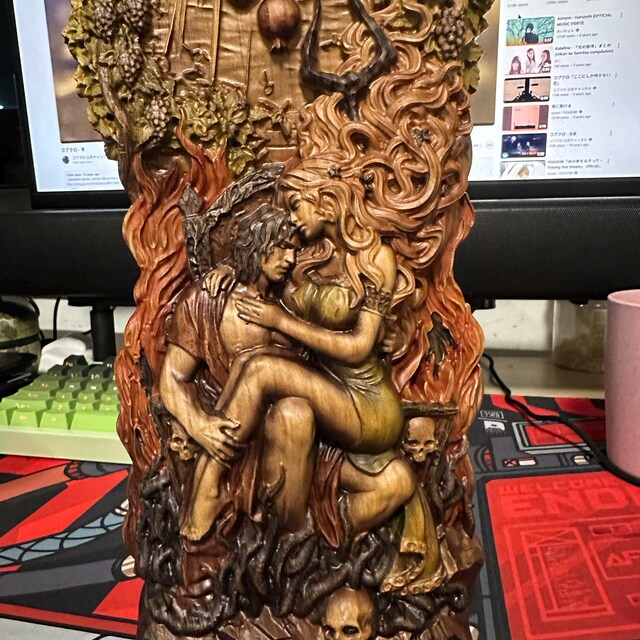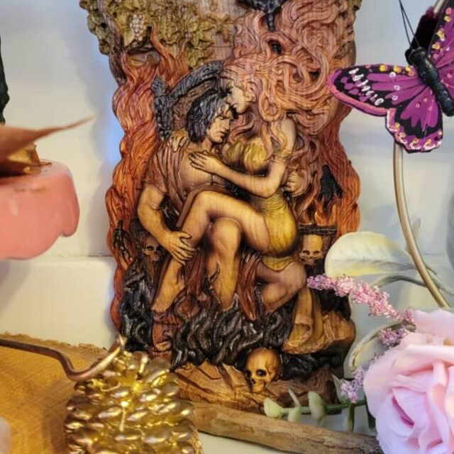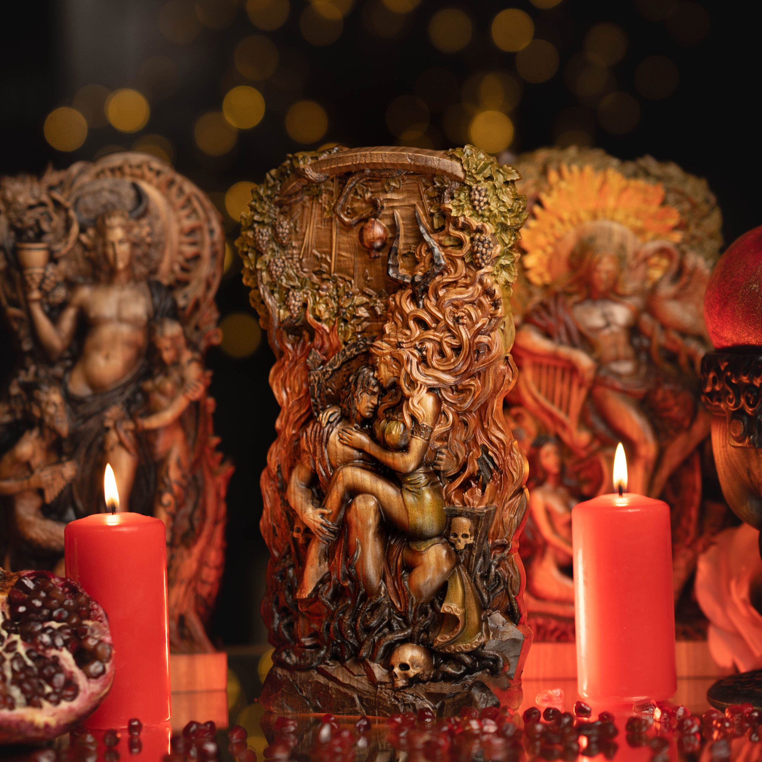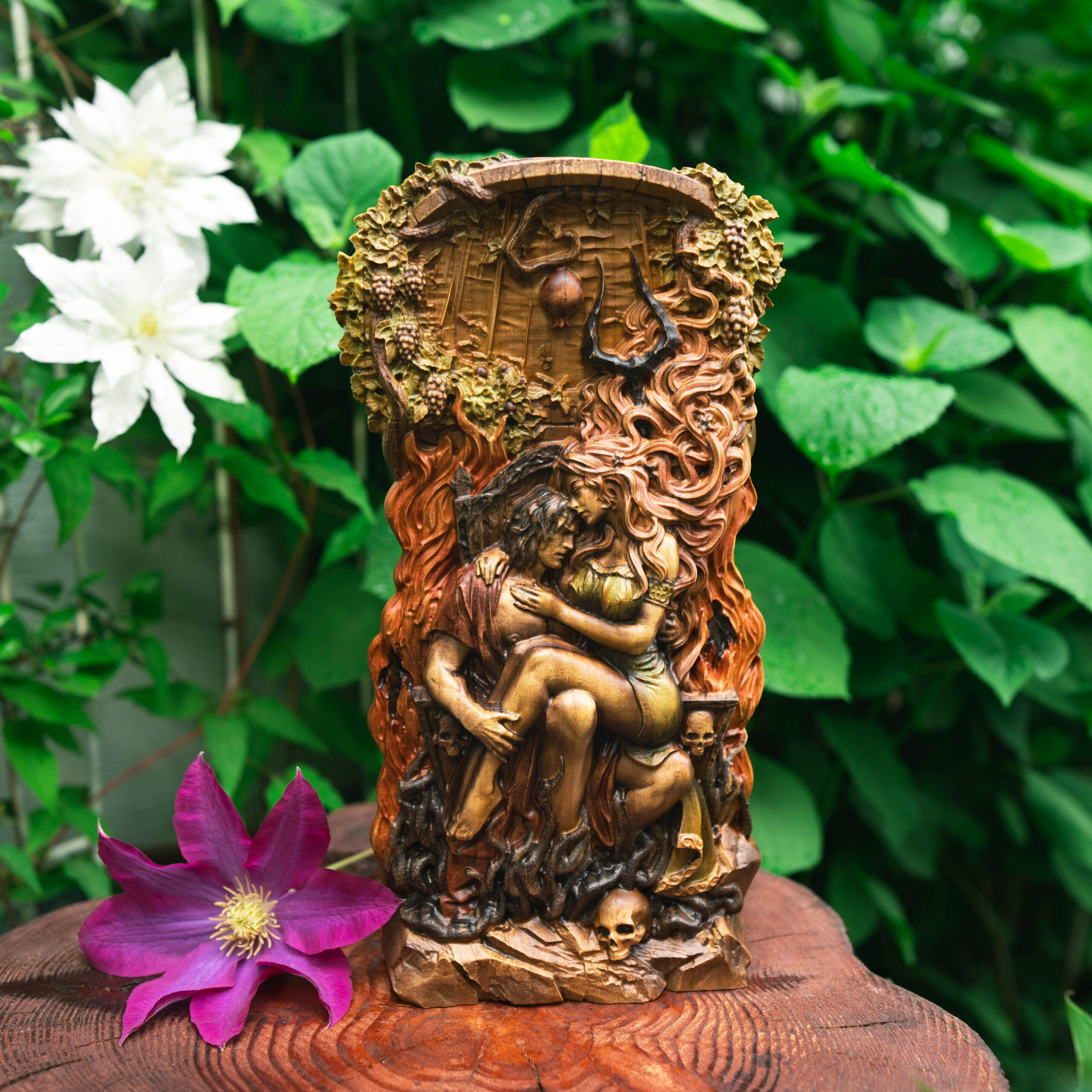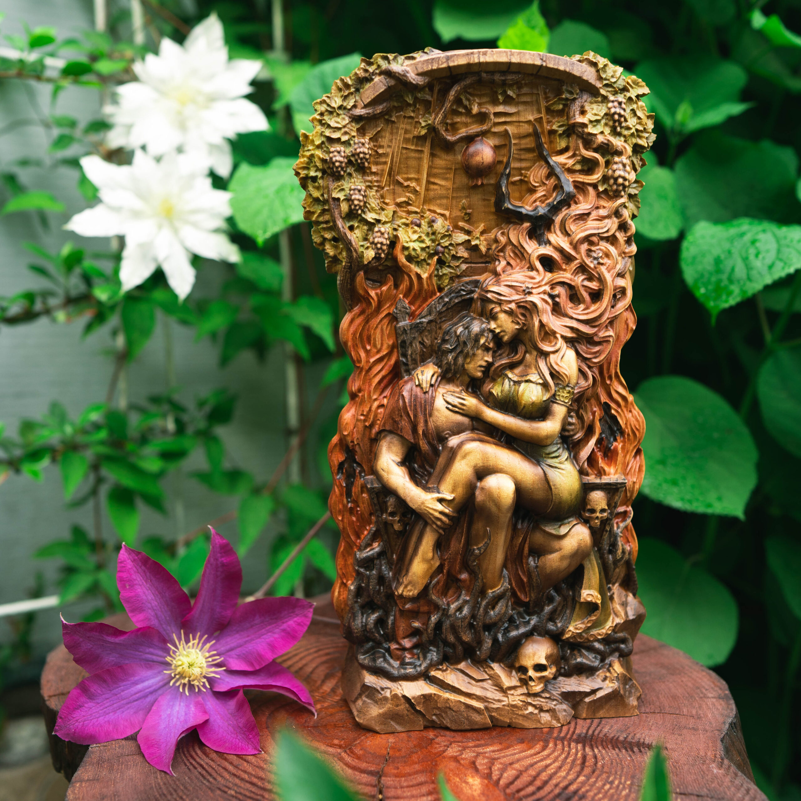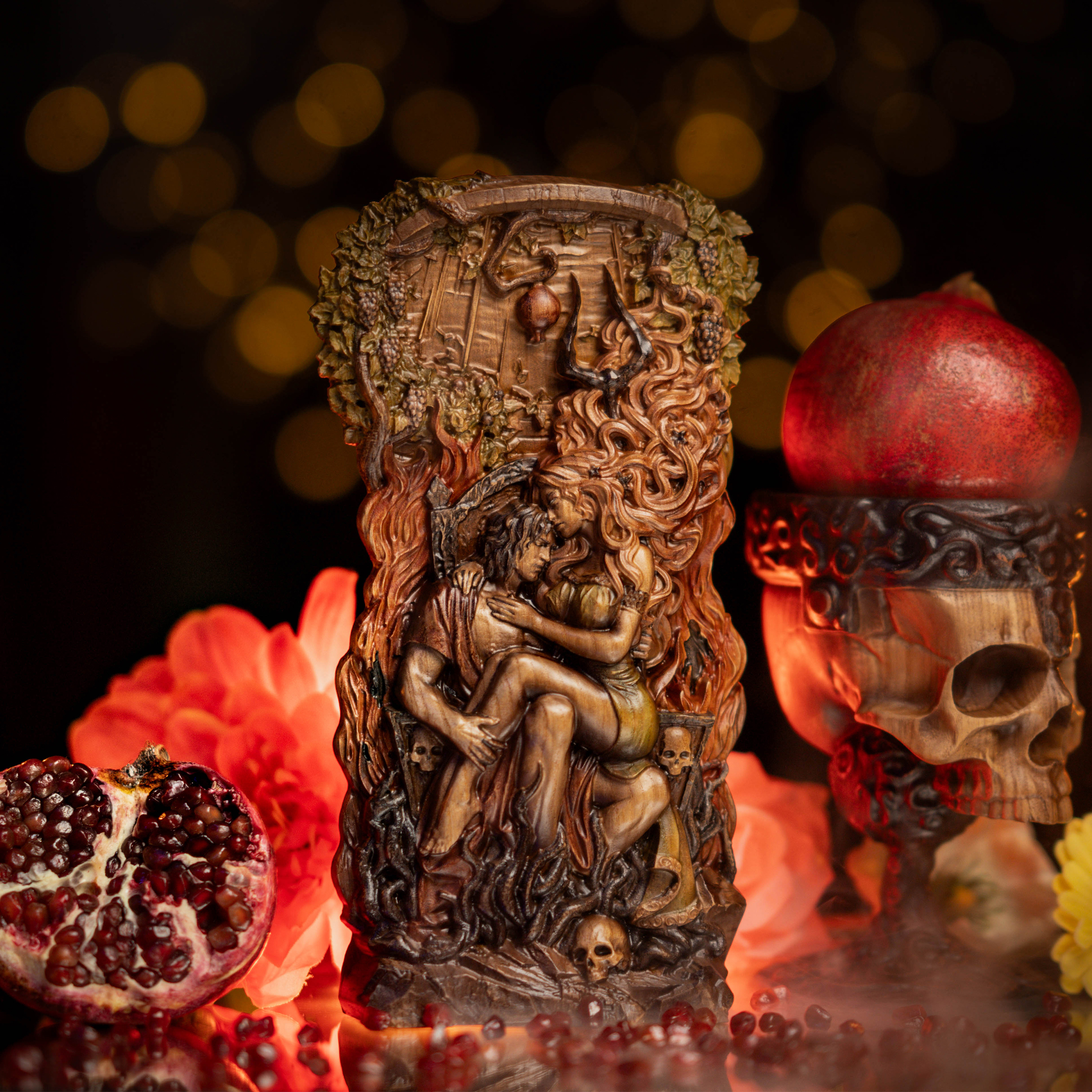 In this sculpture, I sought to embody the unity of opposites — the inseparable bond between life and death through the mythological union of Hades and Persephone. The King and Queen of the Underworld sit upon a throne that resembles the depths of a dark well, yet life’s enduring force stretches toward the light, bearing its symbolic fruits. The pomegranate and skull serve as mirrors of this duality, representing the symmetry of existence and decay.